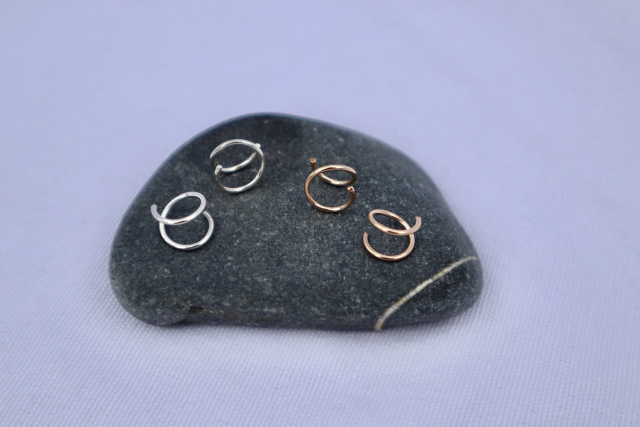 Sterling Silver or Gold Fill Ear Twists. These little huggers twist into your piercing and give the appearance of a double hoop. You can throw them in and leave them on for weeks- super comfortable and easy to wear!