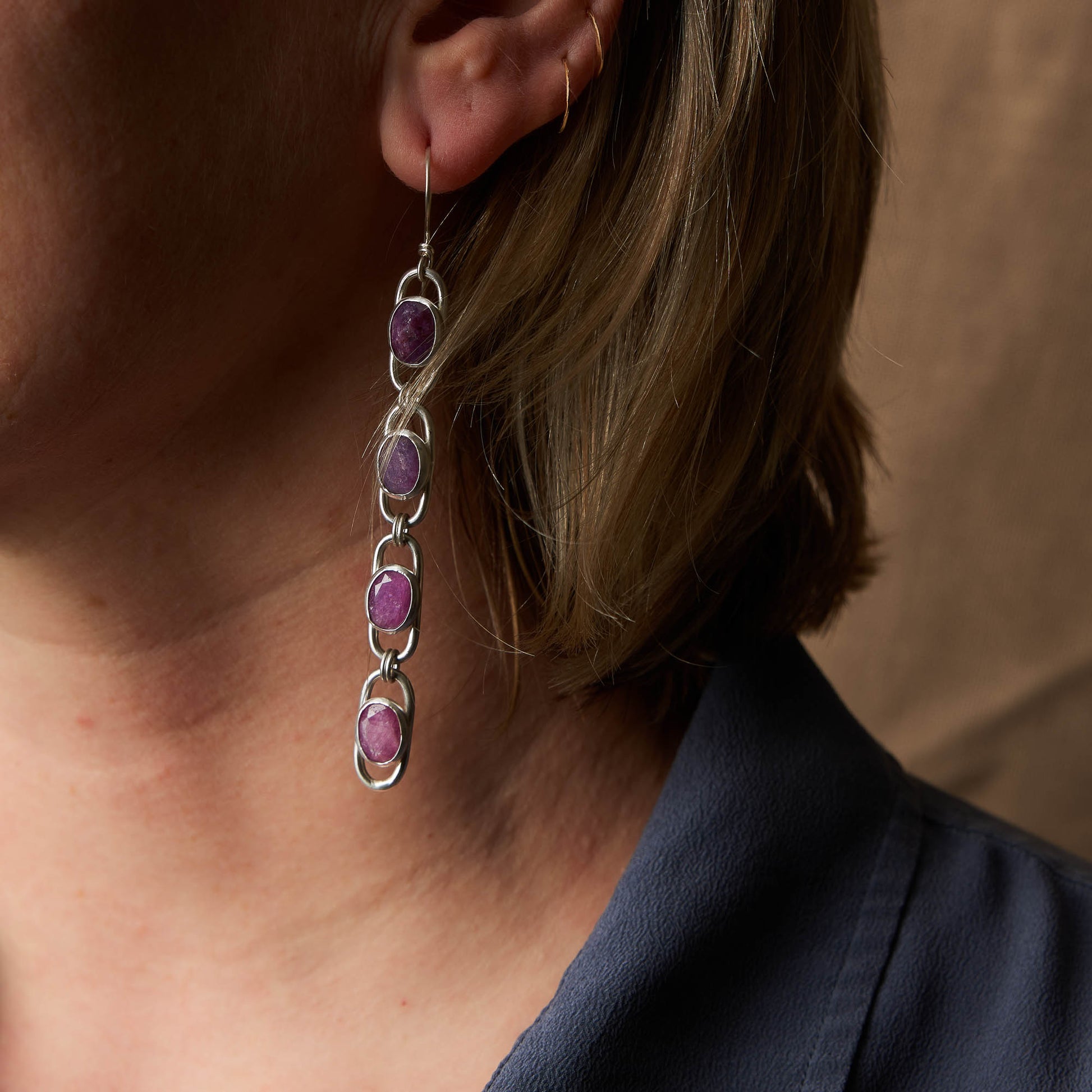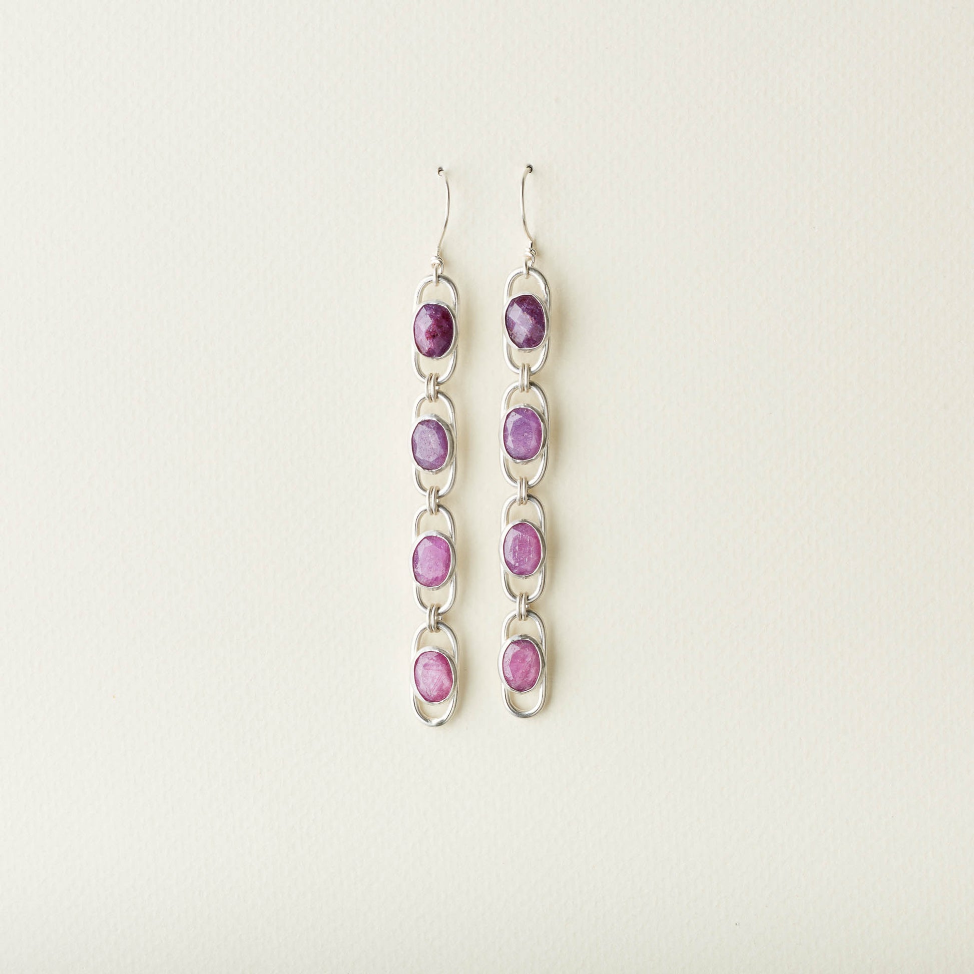 The colorful gemstones are an ombre array of raw faceted Ruby, hand selected for beauty.