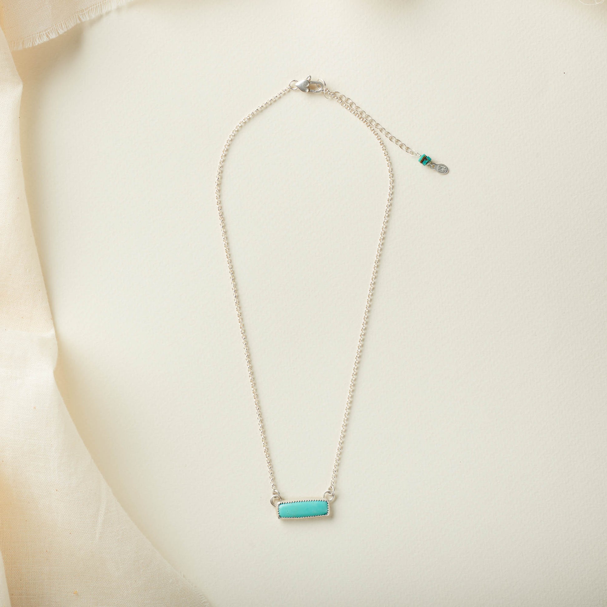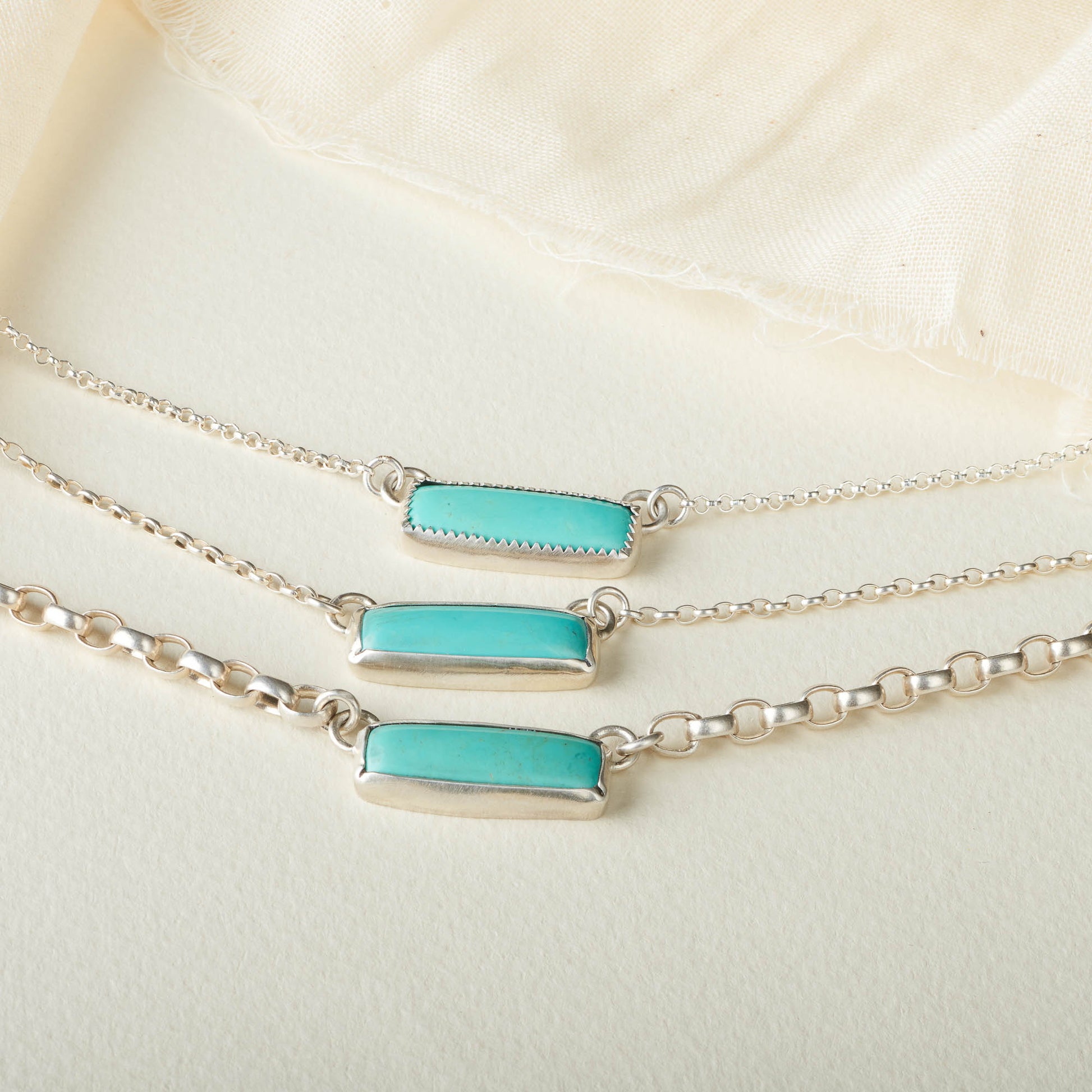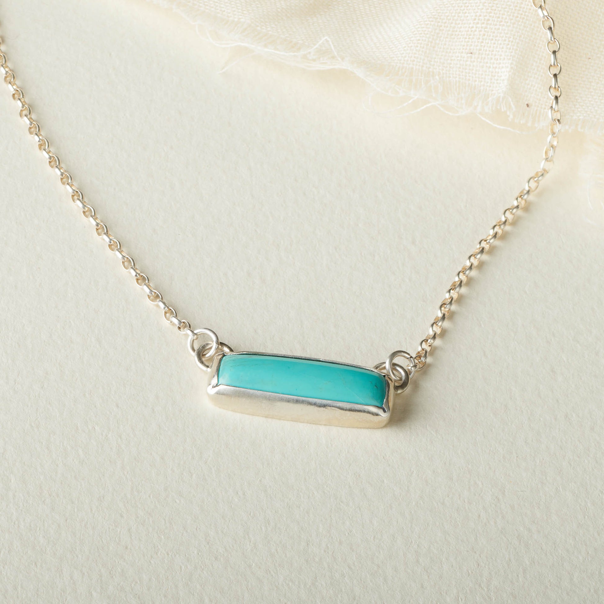 Meet your new best friend! These beautiful necklaces are everybody’s favorite- a simple slab of Royston Turquoise, mined in Nevada, is set in fine silver on a delicate rolo sterling silver 16” chain with a 2” extender so you can get just the right fit.